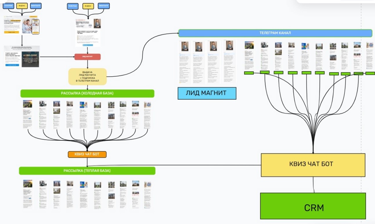 После отправки заявки, лид попадал в Telegram-бот. Там — контентная воронка: цепочка сообщений, которые рассказывают о рынке, жилых комплексах, этапах покупки, об агентстве недвижимости. Без давления, без "купи прямо сейчас". Мы объясняем, подсказываем, создаём доверие.